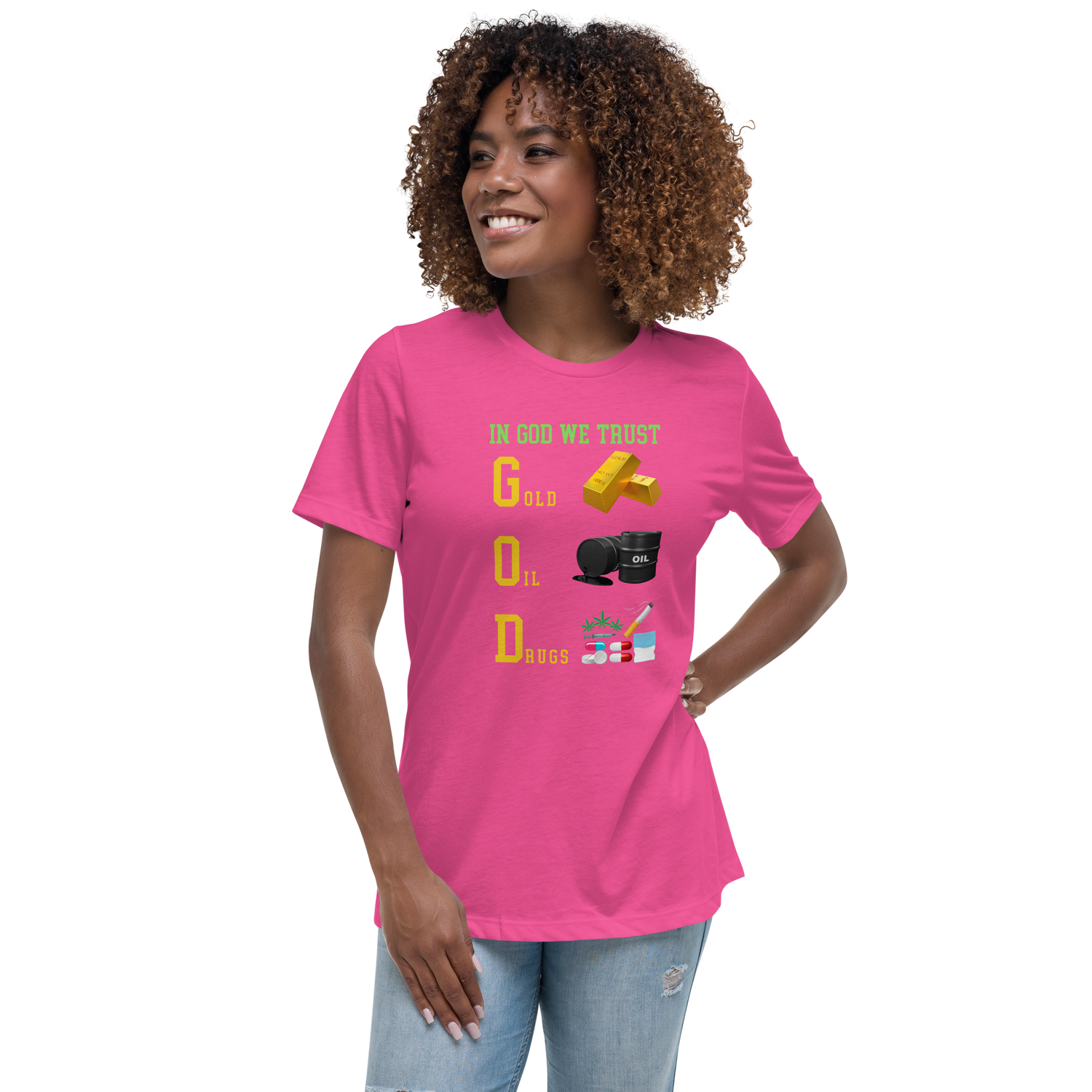 Welcome to Africali Clothing, where truth meets style. Our 'In God We Trust' T-shirt crafted in 100% cotton for a relaxed women’s fit redefines the motto on every dollar bill. Here, GOD is Gold, mined from Africa and plundered by the West; Oil, fueling wars in the Middle East for the petrodollar’s reign; and Drugs, from Big Pharma’s grip to the poison flooding America’s streets. Rooted in African resilience and unapologetic vision, this tee is a statement of defiance and unity. Free U.S. shipping, wear the GOD Trust Tee."